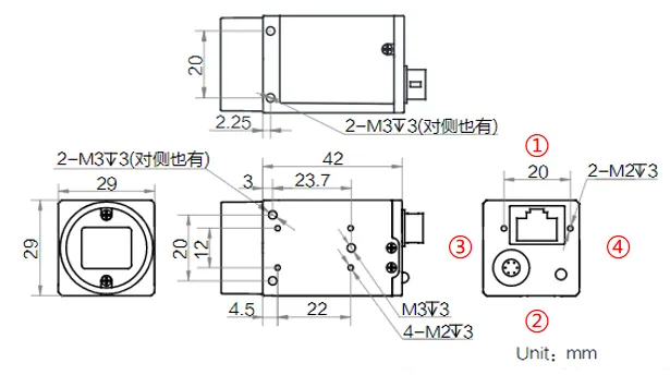 镜像这个在设计前期一定要确认清楚,感觉这点海康设计的不好,相机的4个安装面并不是都是3个螺纹孔。若是固定相机的面是①面,则只有两个螺纹孔,固定不牢固。海康的相机只有第②个面才有三个螺纹孔。