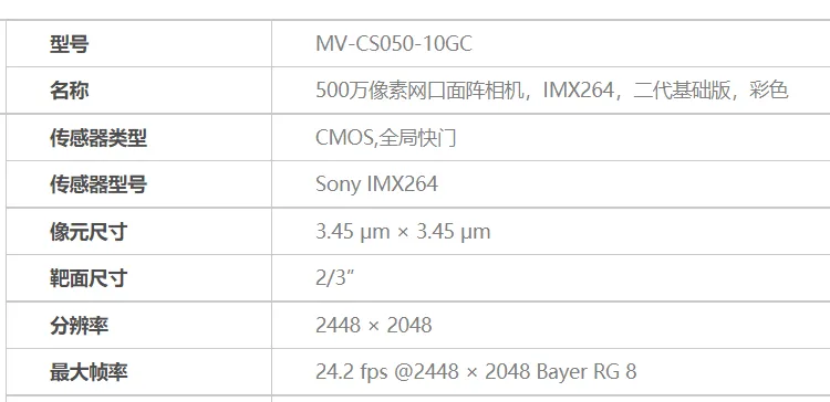 例如:MV-CS050-10GC的像元尺寸3.45μm×3.45μm,靶面尺寸2/3”。分辨率2448×2048。