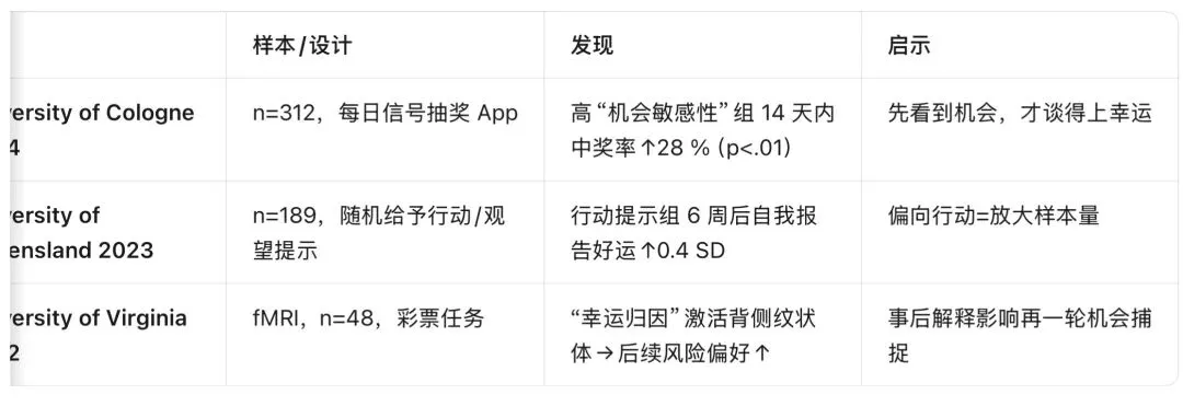 视觉搜索任务中,高幸运者发现隐藏图案速度↑22 %;训练:每日“机会计数”→把遇到的潜在好事件写下来。