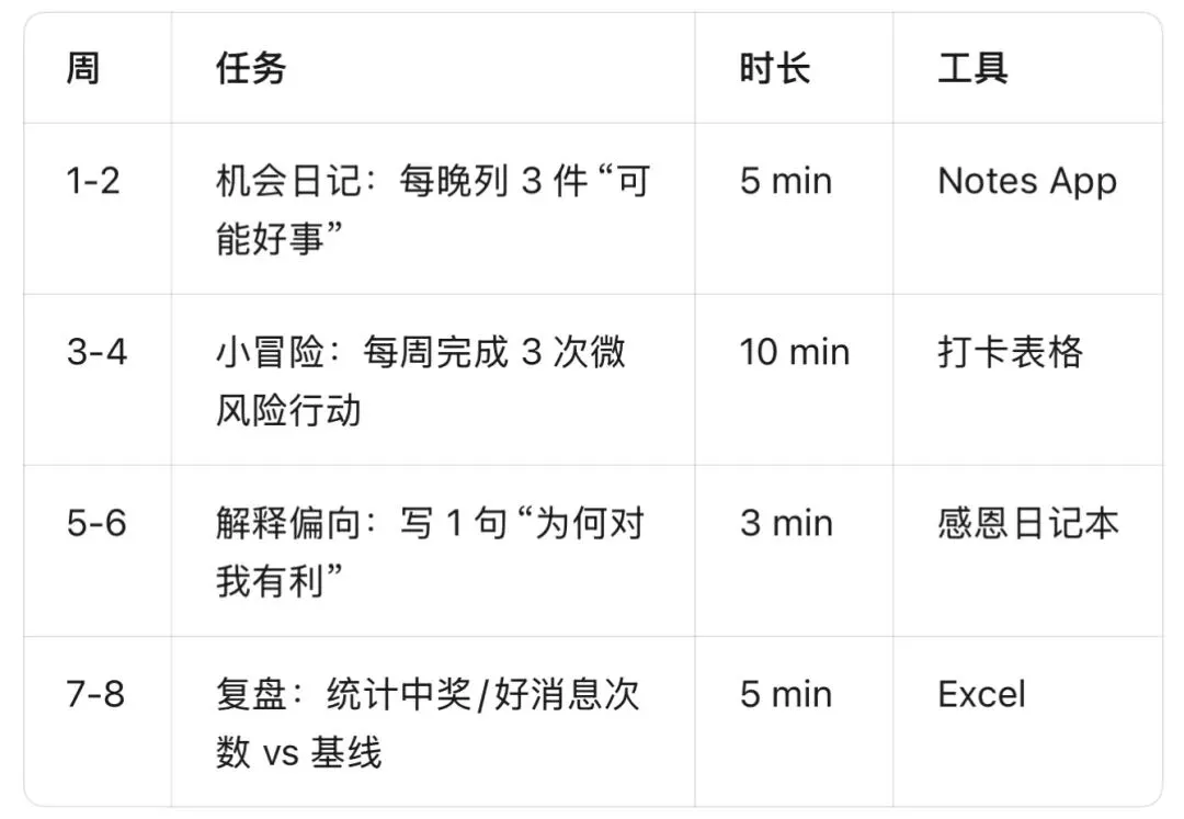 四项每周练习——机会日记、微风险任务、积极再解释、结果追踪——在八周内将自评运气提升0.6 SD。
