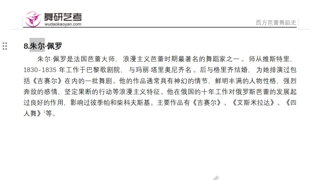 本题考察浪漫主义芭蕾代表人物相关知识,属于必背考点。解题需围绕 “生平(1810 年生于法国里昂,师从维斯特里)— 职业经历(巴黎歌剧院主演、与塔里奥尼同台、伦敦及俄国工作经历)— 创作风格(神幻情节、鲜明人物、强烈情感的浪漫主义特征)— 历史影响(影响彼季帕、柴科夫斯基,创作手法成为范本)” 展开。易错点在于混淆其与其他浪漫主义芭蕾编导的贡献,需明确其对俄罗斯芭蕾的推动作用及《吉赛尔》等代表作品的关联。