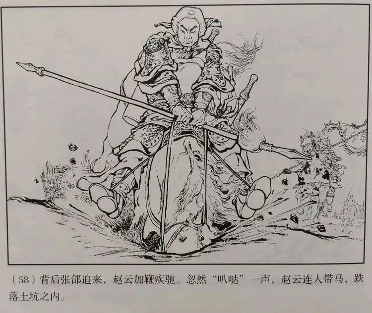 刘锡永绘制的《长坂坡》连环画,采用传统白描里的枣核描技法,极具柔韧性,飘逸灵动。画中人物衣纹线条用中锋劲利笔法,转折处方折硬转,如枣核般圆顿鼓起,充分展现了该技法在连环画创作中的艺术表现力。
