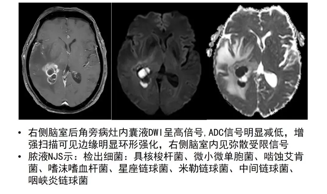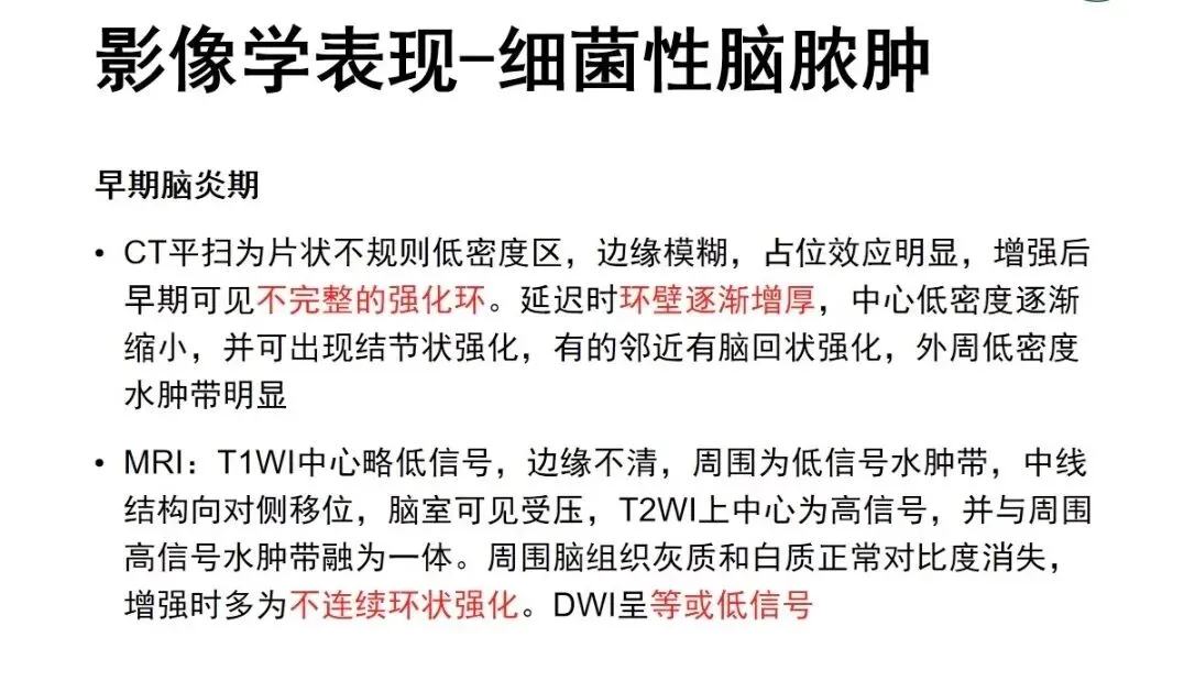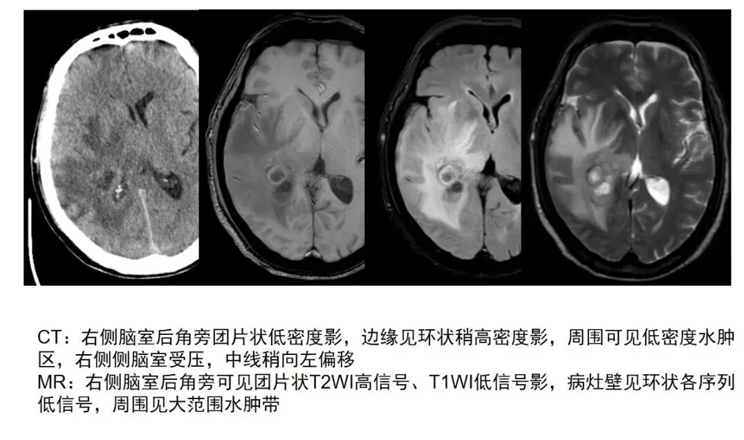 脓肿壁由于有纤维成分可表现为T2等或稍低信号,现在也有说法是由于脓肿壁内存在自由基。脑脓肿还有一个特点是常见卫星灶。