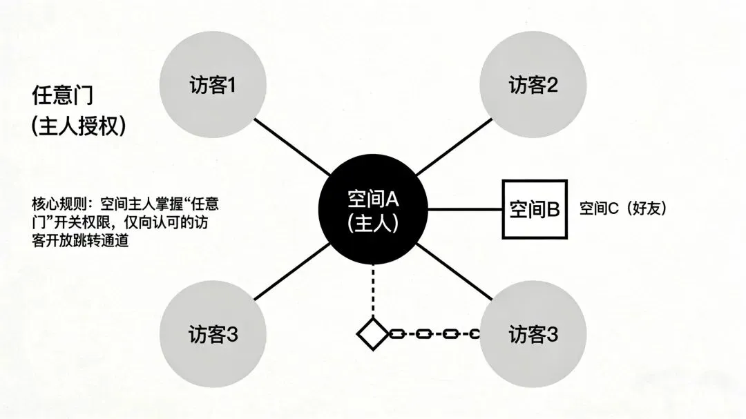 简单说,就是在自己的空间里设一个“任意门”,只要空间主人允许,访客就能通过这扇门跳转到其他相关空间。这种跳转本质上是精准的社交圈层推荐:主人会给认可的好友开放权限,引导访客去其他相关艺术家或好友的空间。这里的“好友认可”,其实就是让主人自己判断哪些空间适合做“邻居”。毕竟现在自动化算法筛选的内容很多都不合格,很容易让访客失望。但会有一些头部空间主人,他们的空间内容做得特别优质,通过他们的推荐和认可,能链接到更多好的空间,这就是去中心化的逻辑——大家会围绕这些优质空间,去认识更多靠谱的“邻居”。