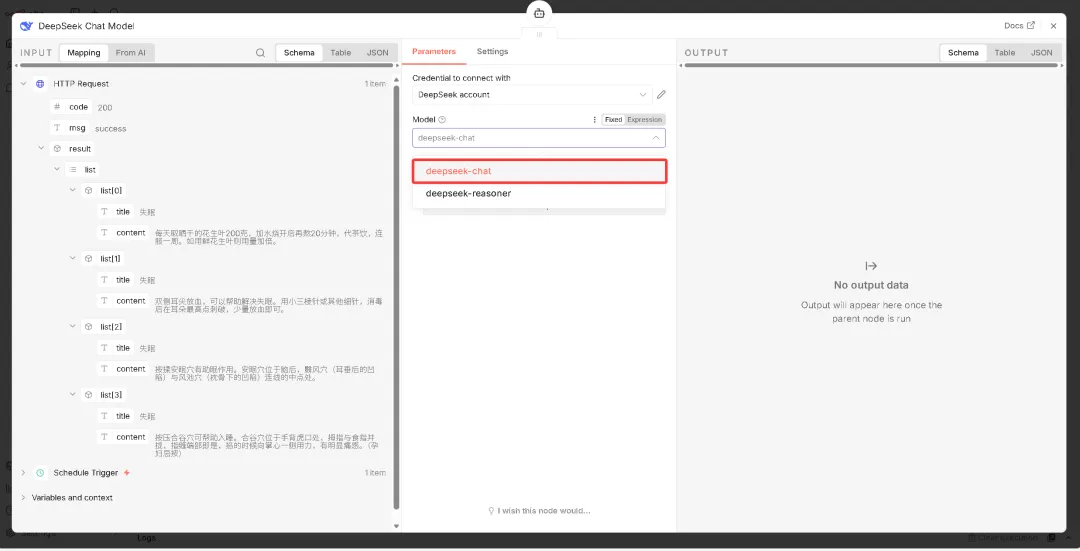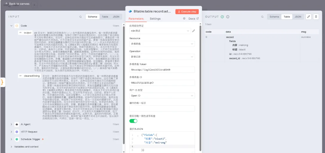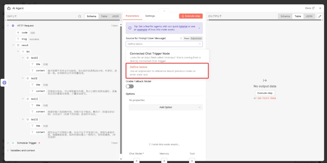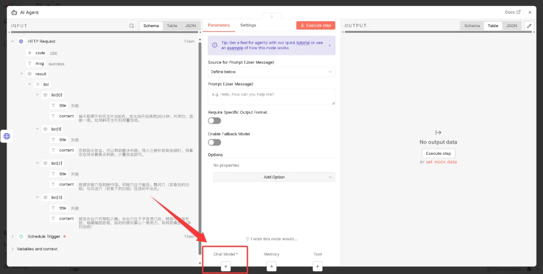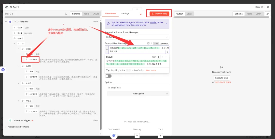 上面大模型配置好之后,回到AI Agent页面,编写提示词(示例:分析内容 {{ $json.result.list[0].content }},返回1200字文章),并传入参数。