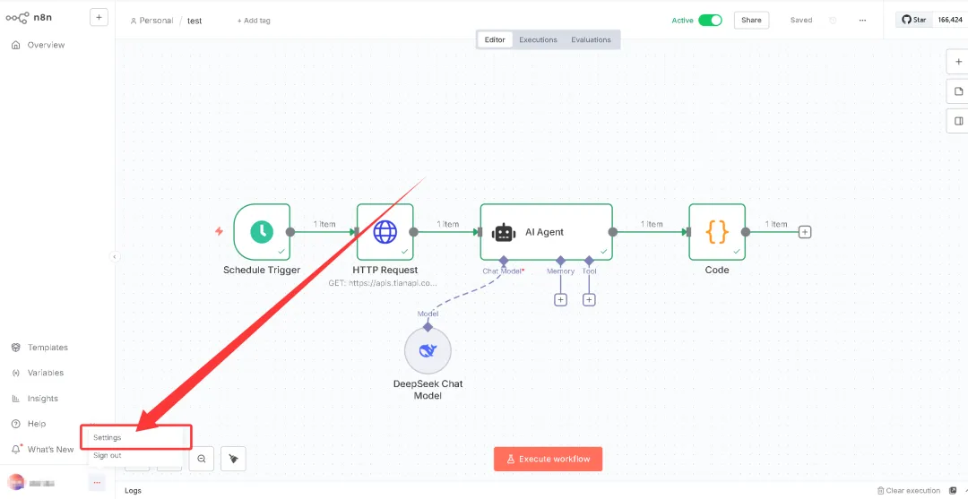 打开n8n主页,然后点下左下方的Settings。