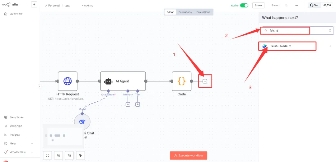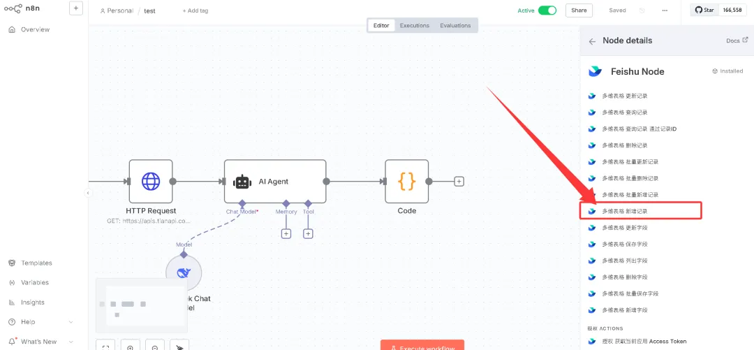 把上面的飞书节点安装好之后,就可以继续在工作流中添加飞书节点。