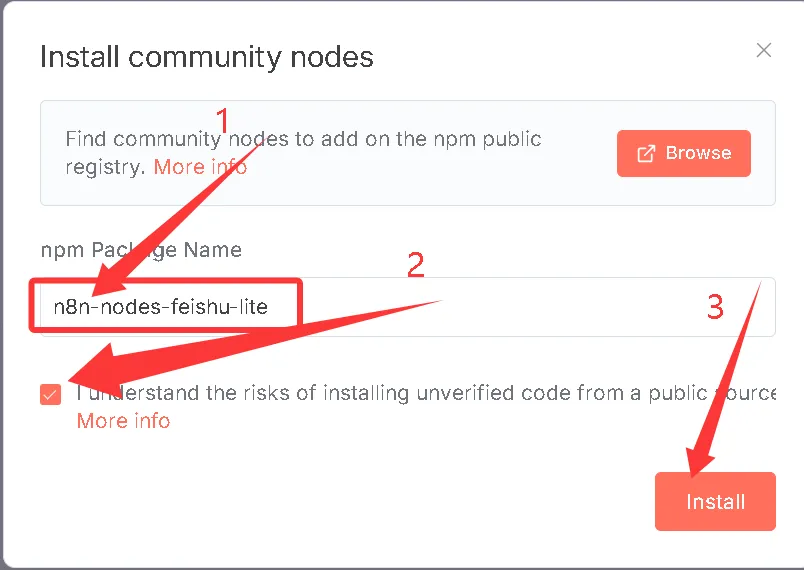 粘贴刚才复制的节点,同意条款进行安装,这样n8n就有了飞书节点。