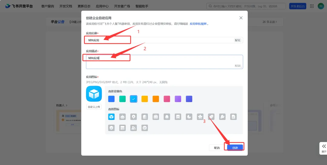 填写创建的应用名称及描述,点击创建。
