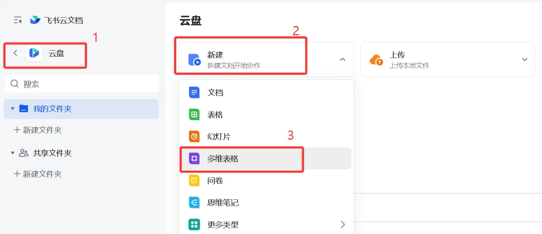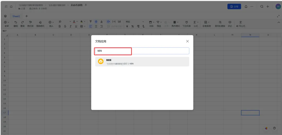 打开飞书网页版,在云盘里创建一个多维表格,然后更多里面关联应用,并添加应用,输入刚刚创建的应用N8N。