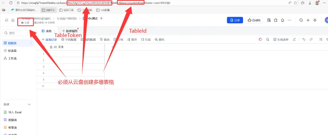 多维表格Token:如图中TableToken(URL中base/后面的那串字符,例如 MascnABCD123456)