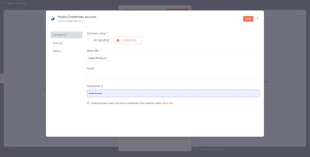 回到工作流中,选择应用级别凭证,填写多维表格Token和TableId,其余的OPen ID不用管,唯一标识不用管。