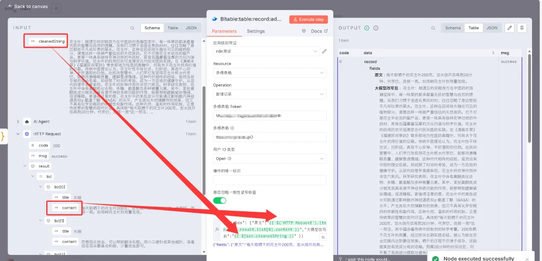 {"fields": { "原文":"{{ $('HTTP Request').item.json.result.list[0].content }}", "大模型改写后":"{{ $json.cleanedString }}" }}