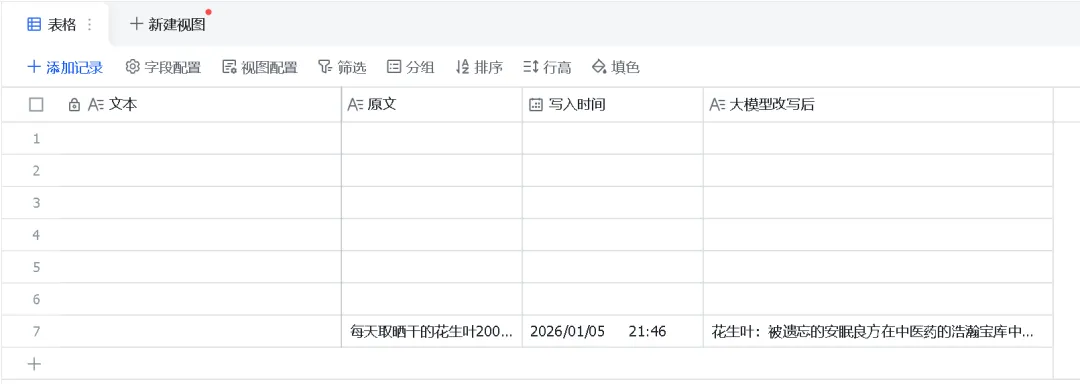 将多维表格中的“标题”和“内容”分别修改为“原文”和“大模型改写后”,即json内key要与多维表格列名一致,修改请求体Json: