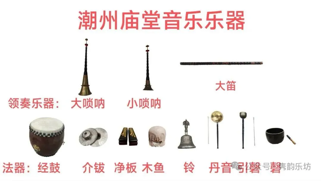 潮汕地区将道家曲调和佛乐统称为「庙堂音乐」,潮州佛乐,源出于潮州开元寺,是从古代宫廷音乐演化而来的,具有潮州地方风格,音韵清越,优美动听,音调幽婉、典雅。潮州佛乐的曲调主要有「香花板」和「禅和板」两种,香花板是本地最古老的佛乐,主要用于做佛事时的唱诵伴奏,禅和板主要用于寺庙唱诵,旋律徐曼优美,令人心旷神怡。