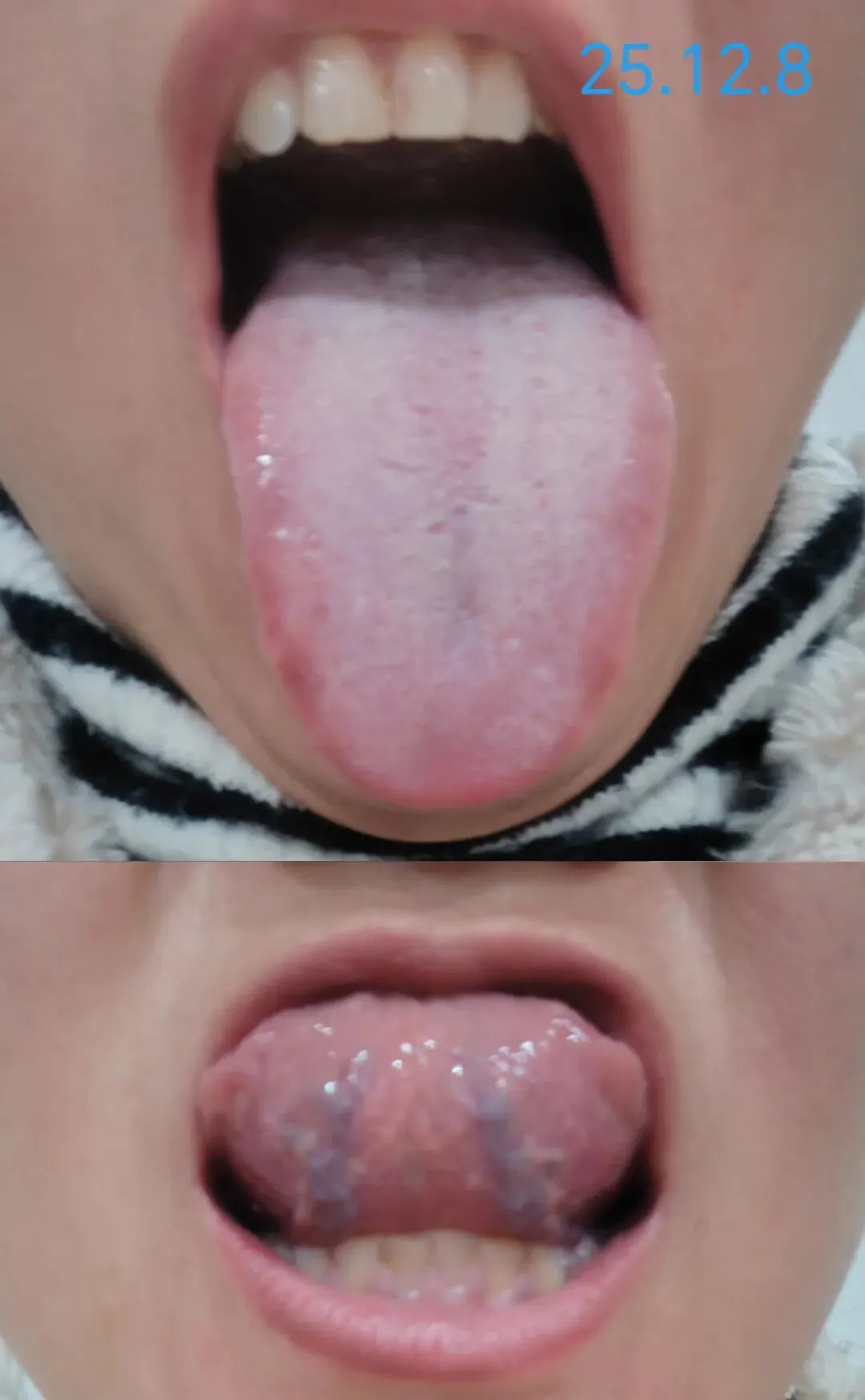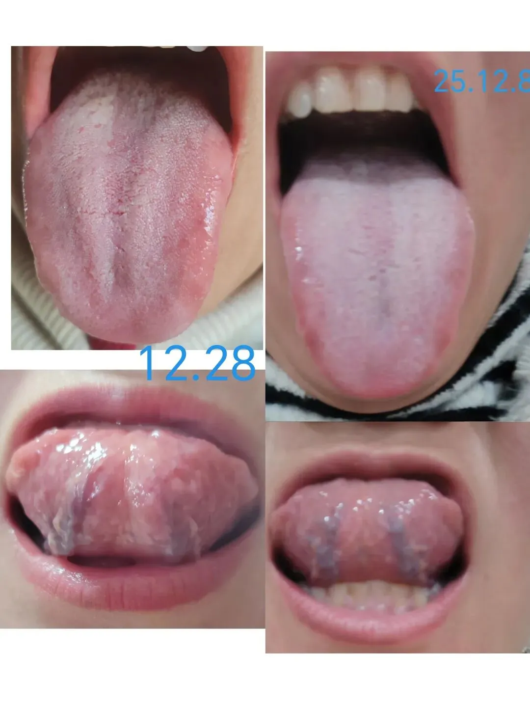 (左为吃完首诊5剂的舌,二诊舌象: 淡红嫩润,苔转淡黄,唾液线变浅,舌下瘀明显减轻。舌中和心肺区稍凹之本象显露。此乃阴血得补,虚热渐清,气机渐畅之佳象。