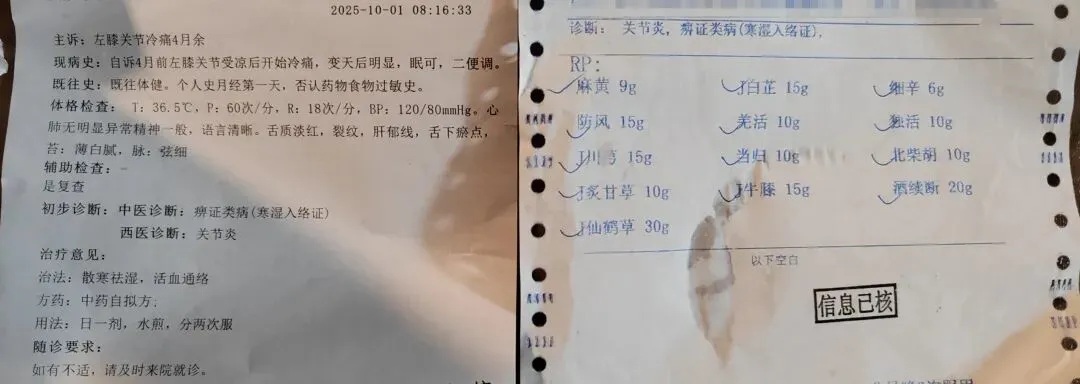 · “膝盖完全不痛了,变天也不痛”——温经散寒、调和气血之功显,伏寒得散。