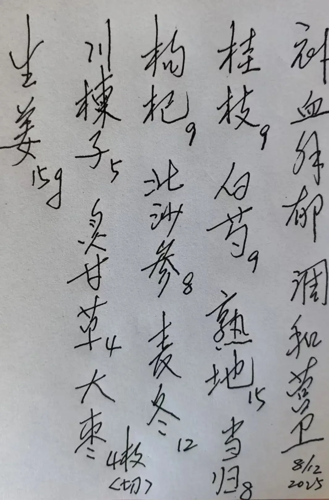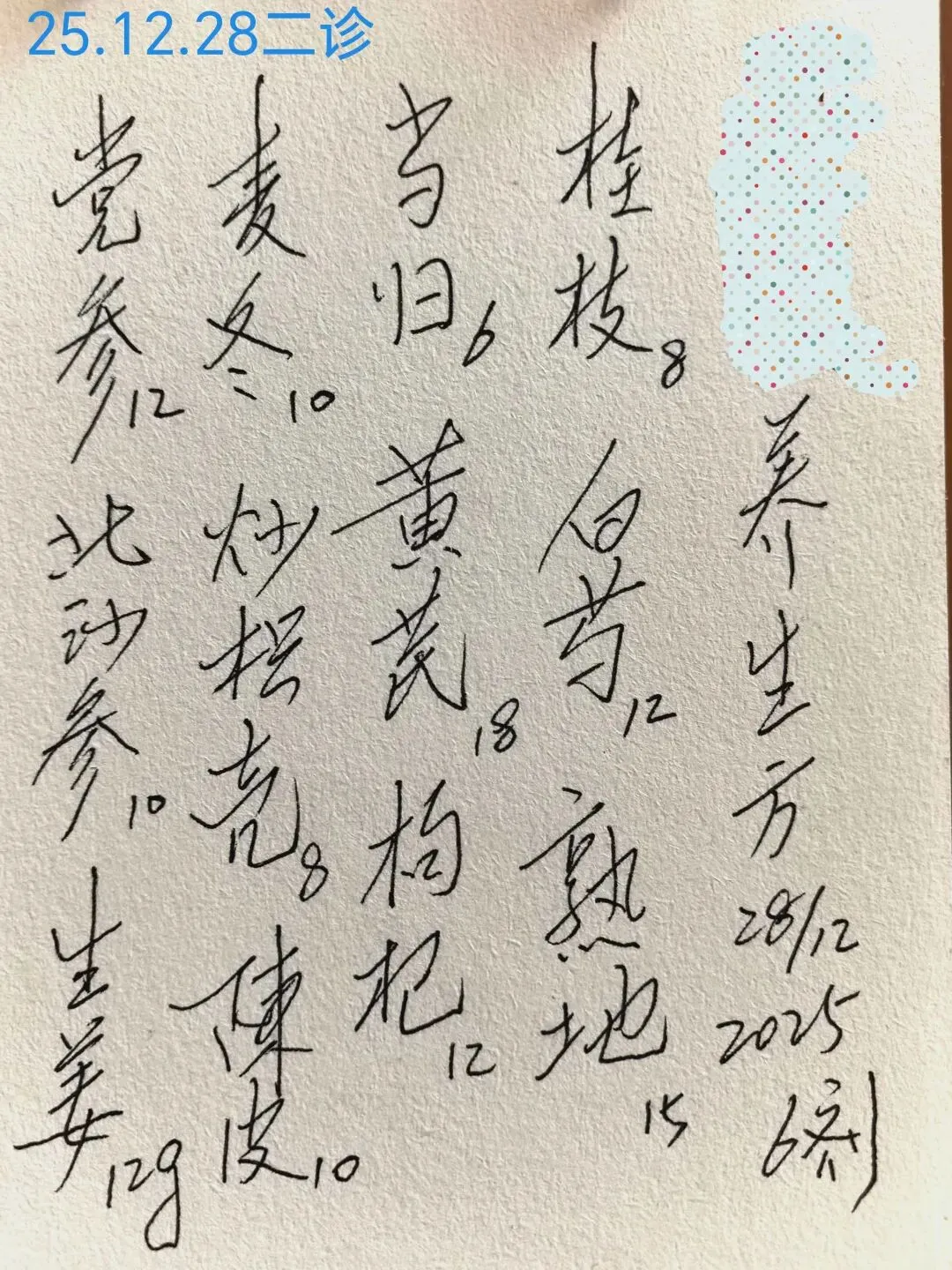 二诊思路总结: 在首诊 “滋阴养血、温通散寒” 打通主证的基础上,二诊转为 “气血双补,佐以理气” 的巩固与调理阶段,体现了 “先解决主要矛盾,再调理后续兼证” 的清晰治疗层次。