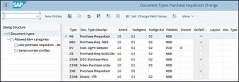- OvRelP…(采购申请的总体释放):此指示符控制采购申请的释放。如果设置了此指示符,则采购申请的所有行项目将一次性释放。采购申请文档类型配置的下一步是将允许的项目类别分配给文档类型。要进行此步骤,请从文档类型列表中选择一个文档类型,然后在对话框结构中双击“允许的项目类别”。下图展示了采购申请文档类型 NB 的允许项目类别。采购中的项目类别用于区分采购文档中不同类型的项目。
