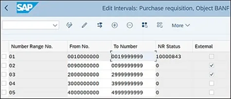 - NoRgeInt(内部编号范围):控制采购申请的内部文档编号。要配置编号范围,请执行事务代码 SPRO,然后导航至“物料管理”•“采购”•“采购申请”•“定义采购申请的编号范围”。您可以通过执行事务代码 SNRO 直接访问此配置。在此配置中,可以针对 BANF 编号范围对象定义内部和外部编号范围。下图展示了内部和外部编号范围的配置。