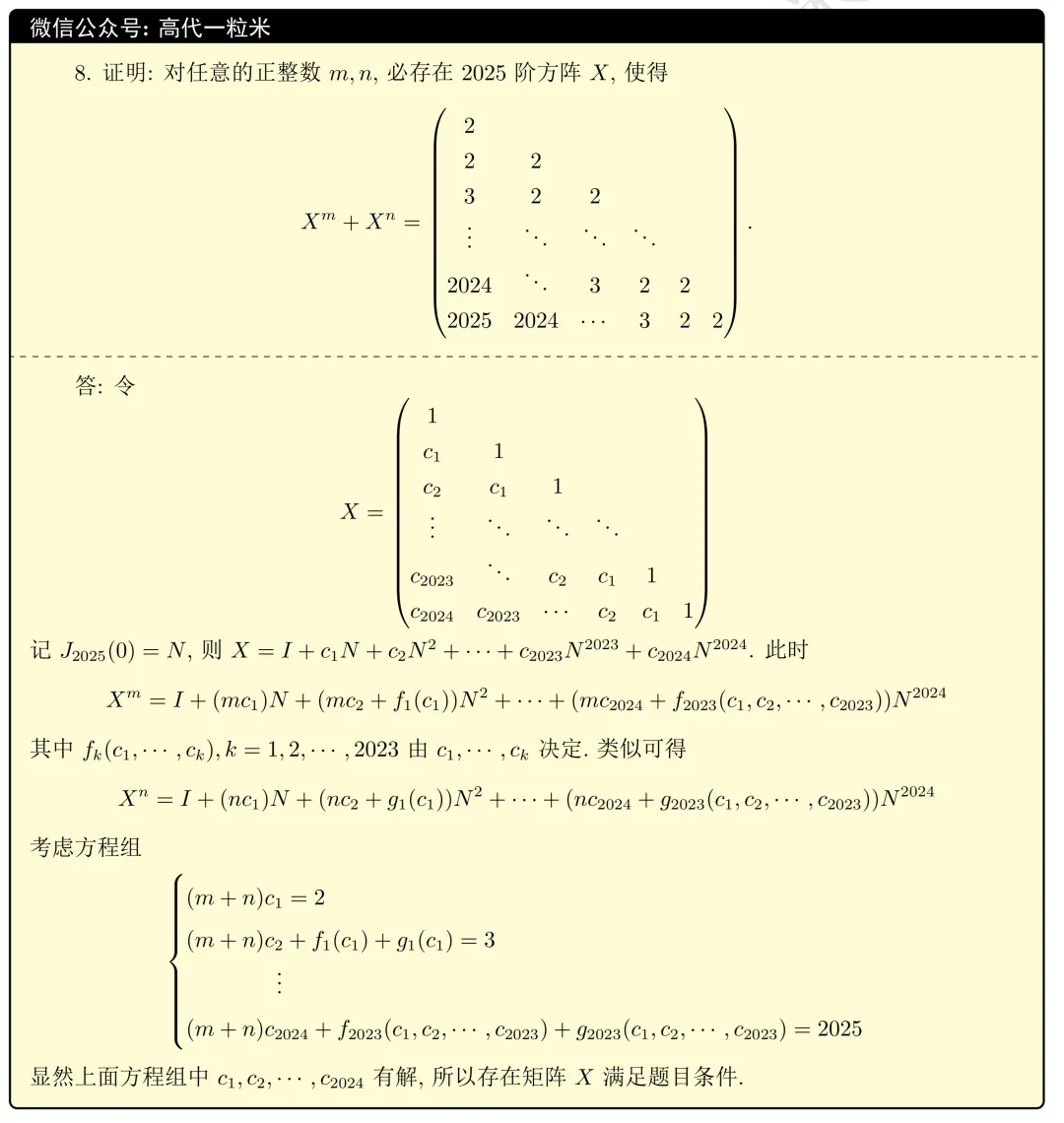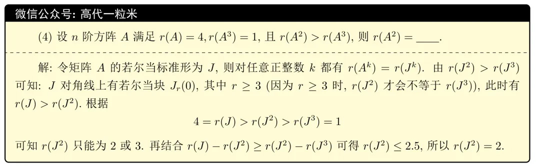 答: 由 是复数域上的 维线性空间, 是 上不可逆且非幂零的线性变换, 可知存在 的一组基, 使得