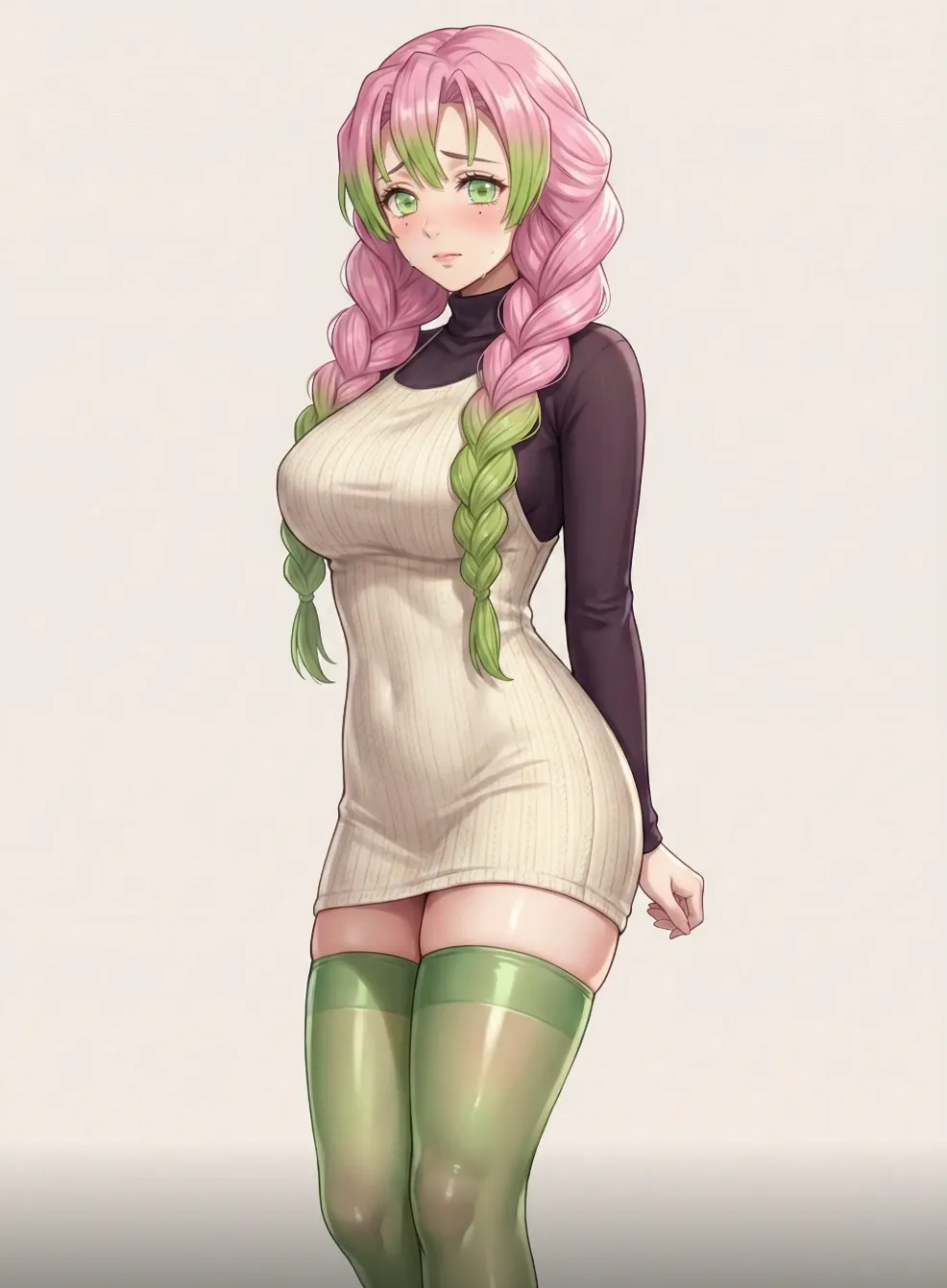 如果说蝴蝶忍是冷冽的毒蝶,香奈乎是静谧的蔷薇,那甘露寺蜜璃就是热烈绽放的向日葵。粉绿色的长发扎成俏皮的麻花辫,灵动的大眼睛下藏着一颗泪痣,健康饱满的身材搭配露出度较高的队服,既散发着少女的纯真,又兼具成熟女性的魅力。