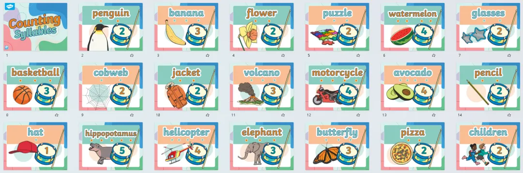 今天分享的是音节划分主题素材,含4套PPT课件、3套教具、5套海报、11套练习和