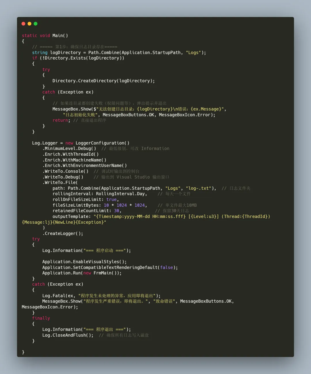 安装完成后, 需要在 Program.cs 中初始化 Serilog, 代码写在static void Main()里面