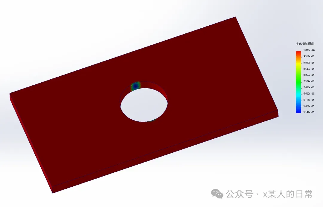 带孔矩形板一侧面均布110000N荷载,另一侧固定,考察结构在当前工况下能够承受的疲劳次数