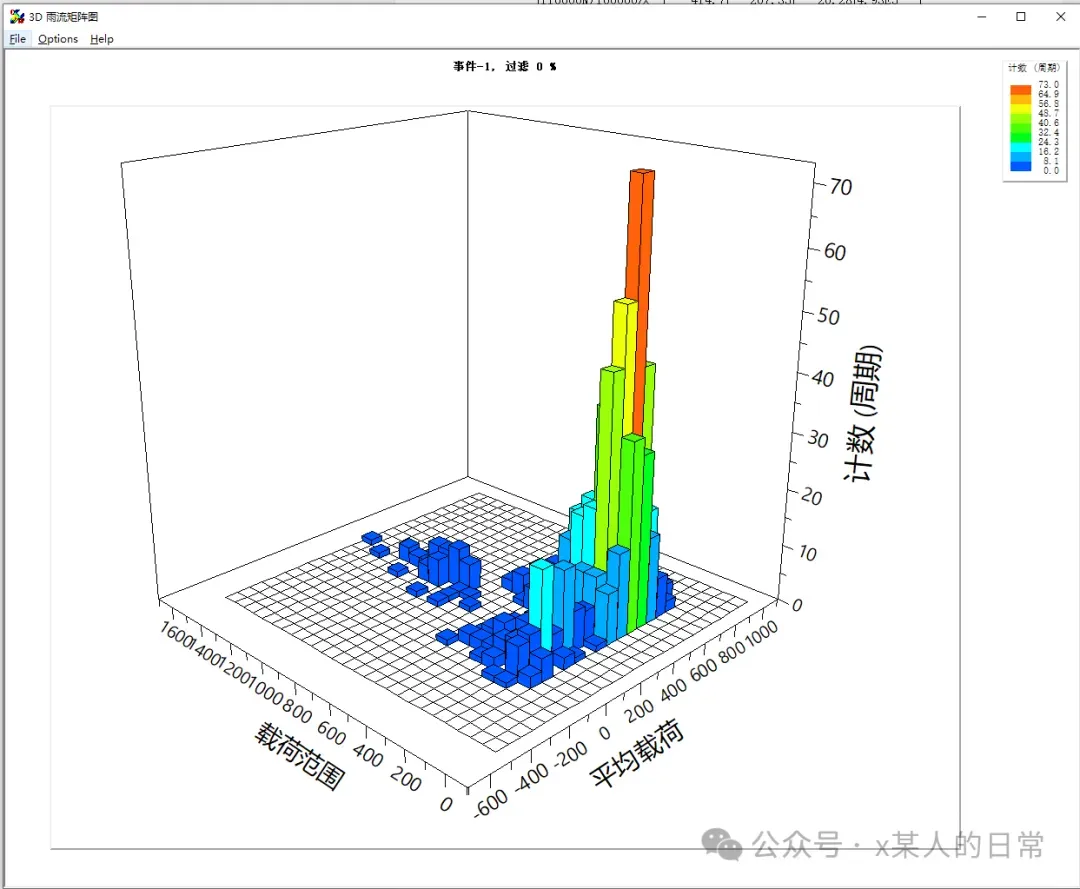 雨流计数箱雨流技术箱是雨流计数法结果的一种统计处理和可视化工具。它本质上是一个二维矩阵或表格,将提取出的所有循环按照它们的均值和幅值进行分类计数。