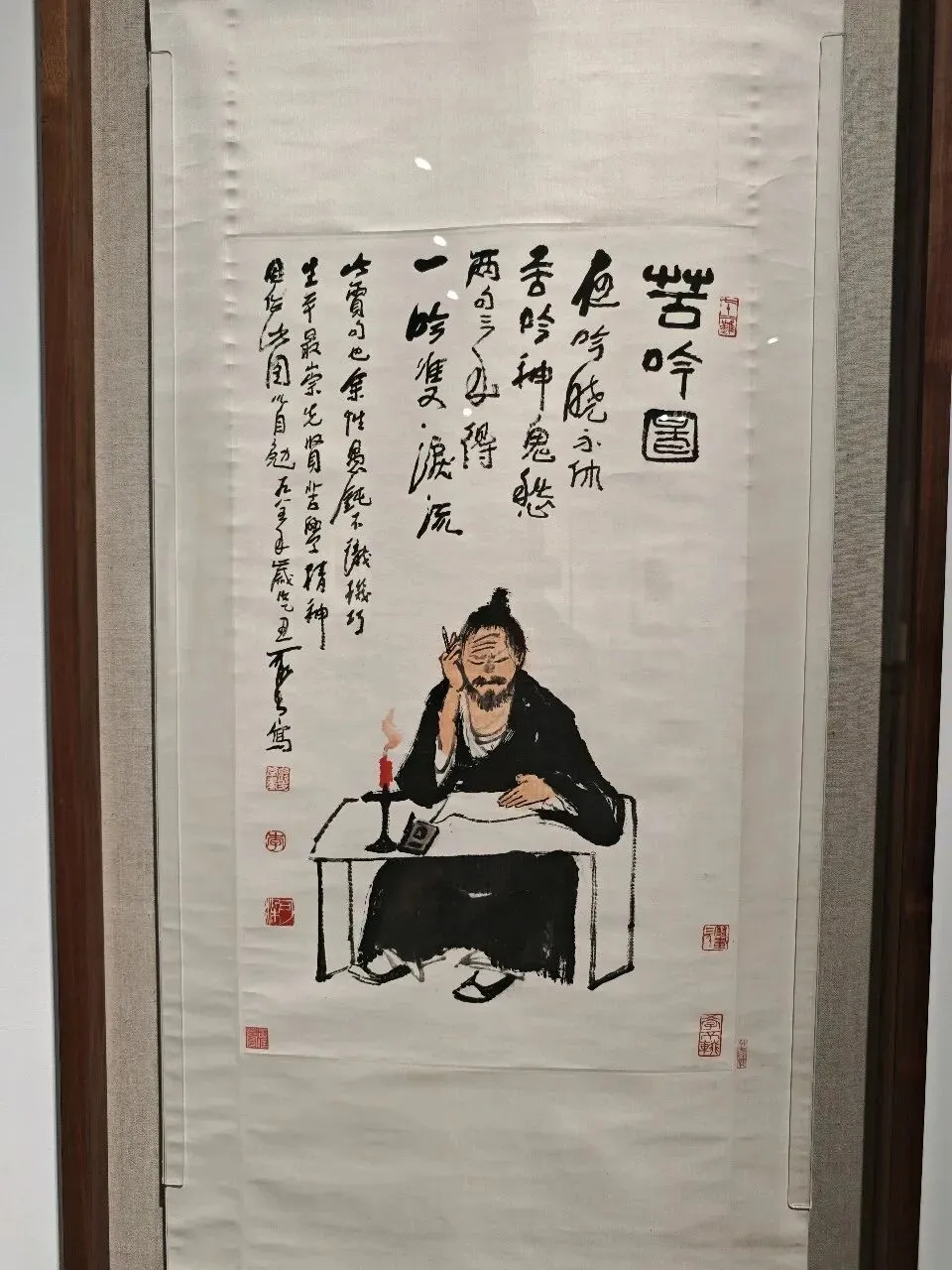 这件作品源于一历史典故,嗜酒如命的东晋官员毕卓,一天因没酒喝,夜不能寐,于是到隔壁的酒馆去偷酒喝,被酒馆的伙计发现,毕卓被绑在了酒坛子边上,不一会儿便酣睡起来。第二天,伙计叫来老板,老板发现绑着的竟然是毕卓大人,立即松绑并责怪伙计。毕卓不仅不恼反而感谢伙计,因为他被他绑住,得以一夜闻酒香。