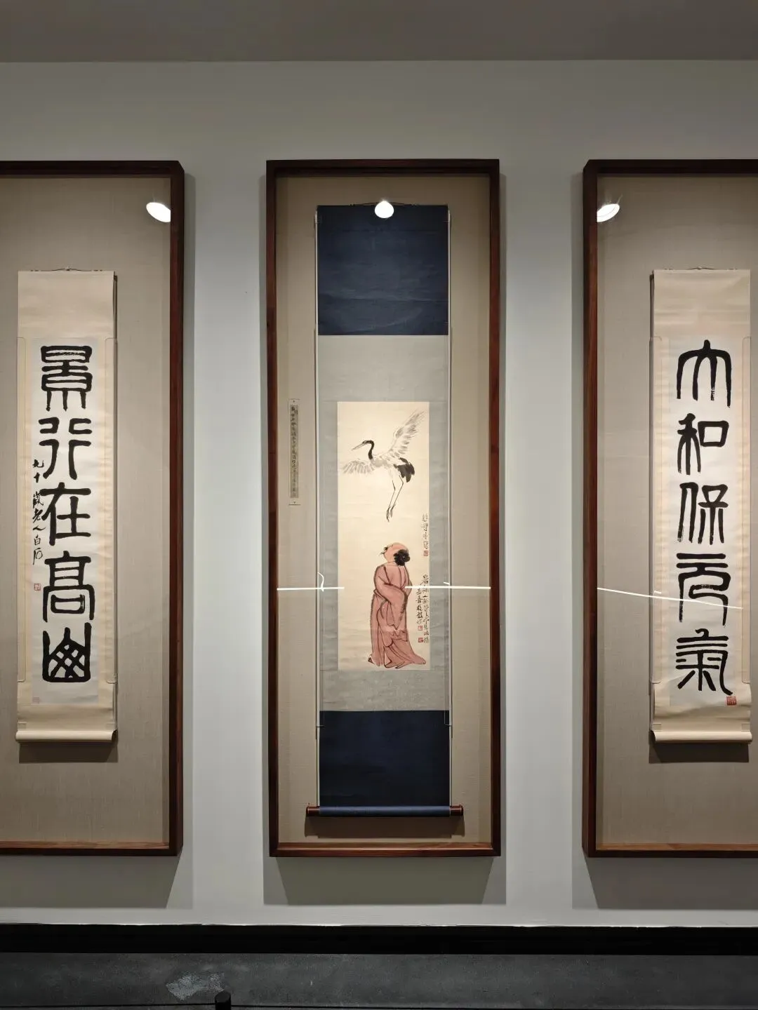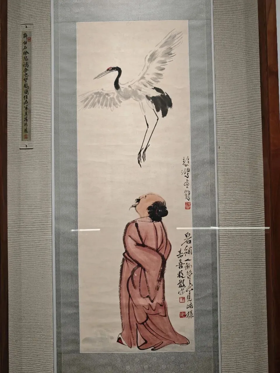 上面这张图是齐白石和徐悲鸿的合作作品,仙鹤是徐悲鸿画的。而且现场配的大对联也很般配