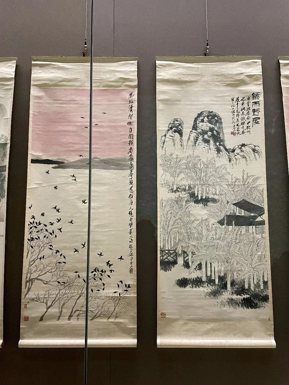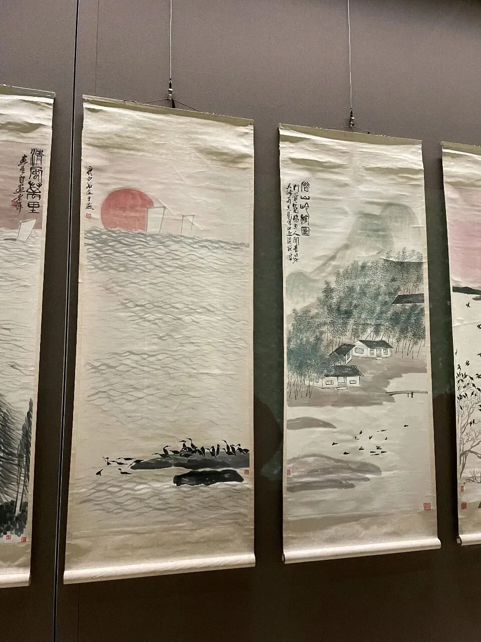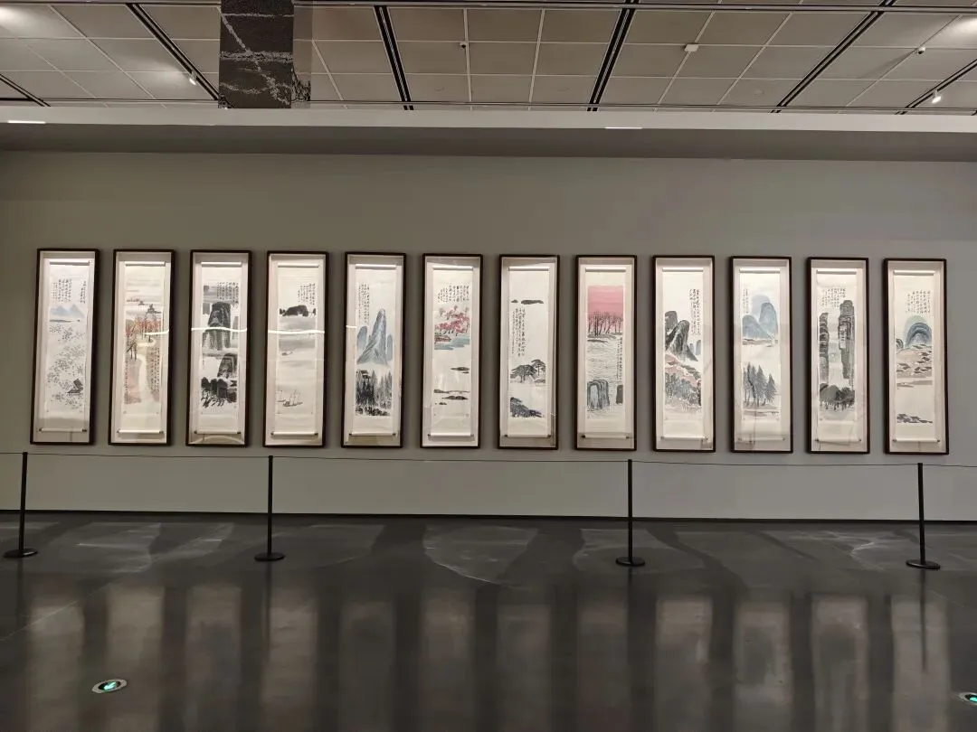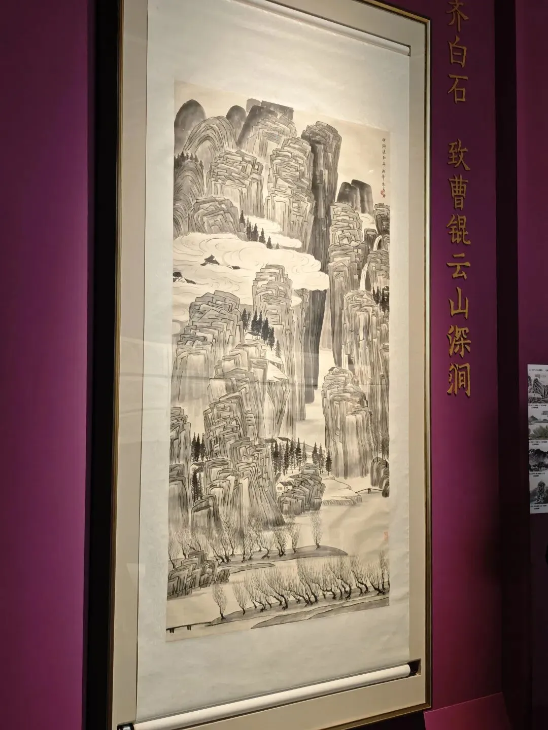 白石老人山水画起点虽然低,但是他一直在努力突破,1902年到1909年他跟着富家子弟们到处游历名山大川,1910年起画《借山图》50余册,又画了有名的《石门二十四景》,此时仍然偏工细一路,但已经有大笔挥墨的轮廓。1917年避祸搬到北京,初入京华万事不顺,就仔细打磨自己的艺术创作。到1921年的《山水册》作品面貌已经突出,册页的山水作品已经成熟。下面三张是成都美术馆展过的作品,具体什么时期忘记了,但感觉是这段时期的。立轴作品,齐老也一直在探索,各种路数都尝试一下,这张嘉德秋拍夜场封面,1922年致曹锟的云山深涧,笔路细致繁密,造型重重叠叠,装饰性强但个性表达不多,就是探索期的代表佳作。接下来是展示的是广汇美术馆的拍卖记录作品《山水十二条屏》,这组图是他立轴山水的成熟标志。现场细节因灯光问题没拍,而且感觉笔墨偏平不立体(瞎猜是复制品)。但没关系,有成都美术馆展过的《山水十二条屏》,应该是齐白石入川时为王瓒绪画的,更加成熟和精到。据说,王当时答应重金请齐老作画,结果打了三四折,给齐老气的不行。此后就假装不认识这位,也没这档子事,后续被追问就说是有个王某人云云。部分细节图如下,可以看出非常用心,可以说是真正的巅峰之作。下面是中国美术馆展过的齐老山水,一看就是为了谋生的。这张是成都美术馆展过的1938年的《桃花源》佳作。这张作品为北京画院藏,题款如下:平生未到桃源地,意想清溪流水长。窃恐居人破心胆,挥毫不画打鱼郎。戊寅,时居燕京城西,白石齐璜。本想着一口气把白石老的山水、人物、花鸟、书法一并给罗列完,但内容实在是太多,就容我分几期罗列再说。