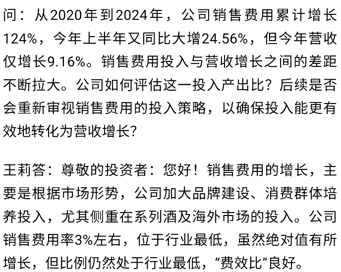 贵州茅台销售费用权威解释:王莉总在2024年中报业绩说明会答投资者问内容之一: