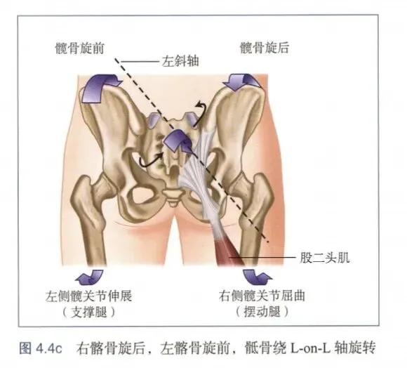 足趾离地时,支撑侧髋骨(如右侧)开始旋前,对侧髋骨(左侧)开始旋后。