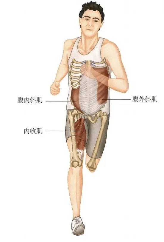 肌肉:支撑腿内收肌 + 同侧腹内斜肌 + 对侧腹外斜肌。