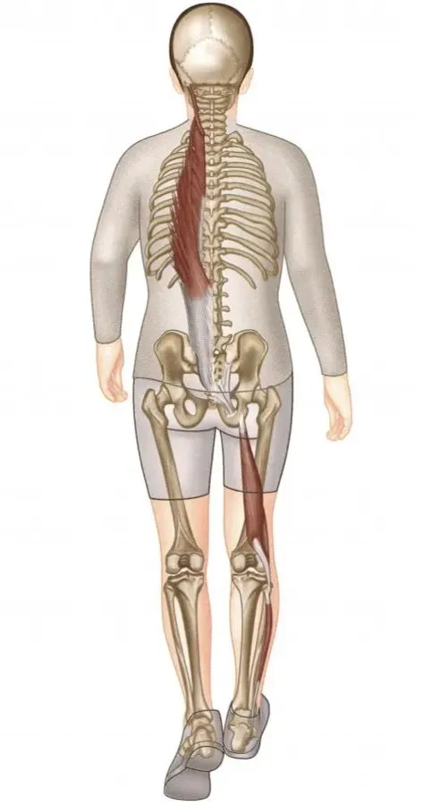 路径:胫骨前肌 → 腓骨长肌(附着于第一跖骨和内侧楔骨)→ 腓骨头(也是股二头肌附着点)→ 股二头肌 → 坐骨结节/骶结节韧带(约50%的人,此韧带直接延续为股二头肌长头腱)→ 对侧(对侧)多裂肌和竖脊肌 → 枕骨。