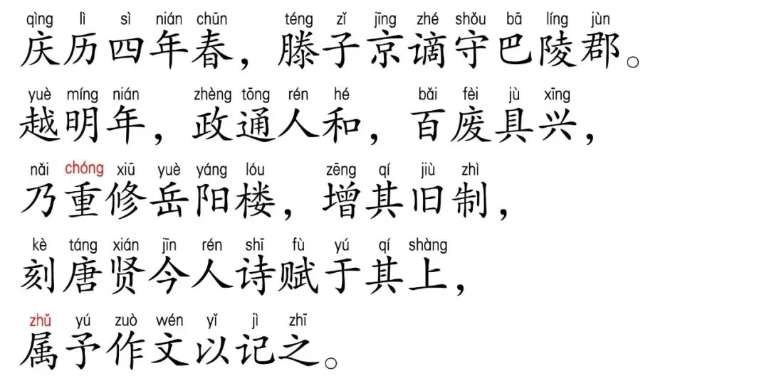 庆历四年春天,滕子京被贬谪到巴陵郡当了知州。到了第二年,政事顺利,百姓安居乐业,各种荒废的事业都兴办起来,于是(他)重新修建岳阳楼,扩大它原来的规模,在楼上刻了唐代名人和当代人的诗赋。(滕子京)嘱托我写一篇文章来记述这件事。