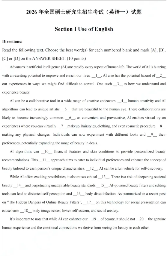 今天给大家准备的是:2026年考研英语一、英语二真题及参考答案(完整版)