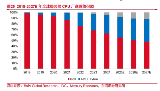 桌面级和服务器CPU市场X86架构主要有2家厂商inter和AMD占据,非X86架构CPU厂商市占率在不断提升。