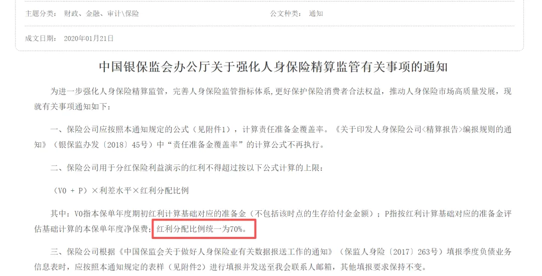分红保单(Participating Policy,或With-Profits Policy)是一种为保单持有人派发非保证分红的保险合约。保单持有人与保险公司股东会按照一定比例“分享”保险公司经营该保险业务所取得的利润(称为“可分配盈余”)。后续会详细介绍可分配盈余。中国银保监会发布了《关于强化人身保险精算监管有关事项的通知》限定分红险红利分配演示利率上限,并将红利分配比例统一为70%(且为最低比例)。