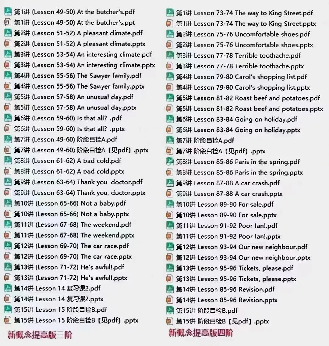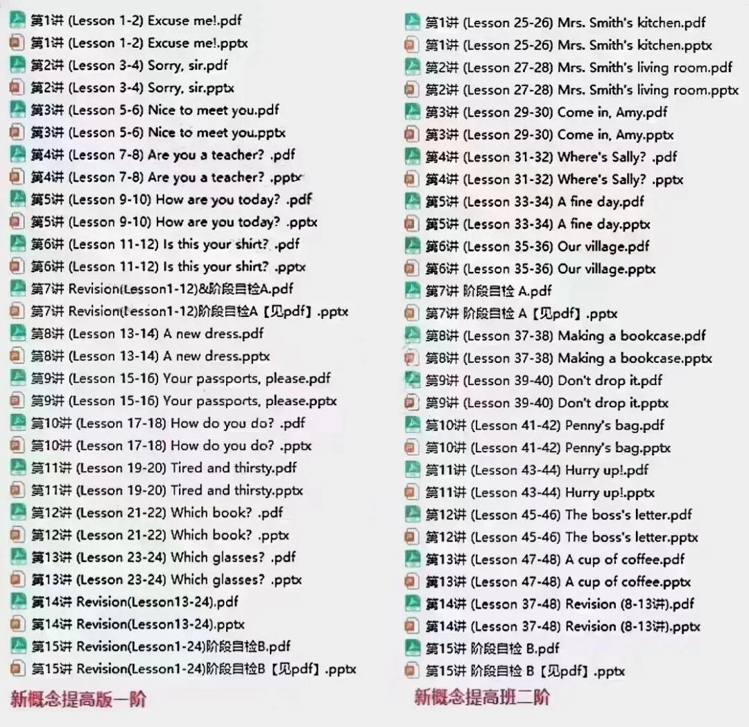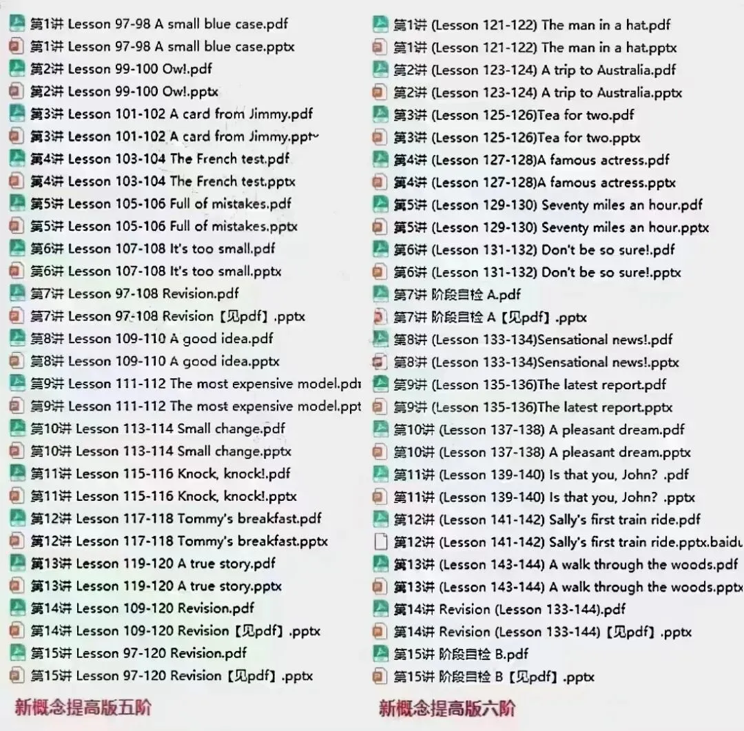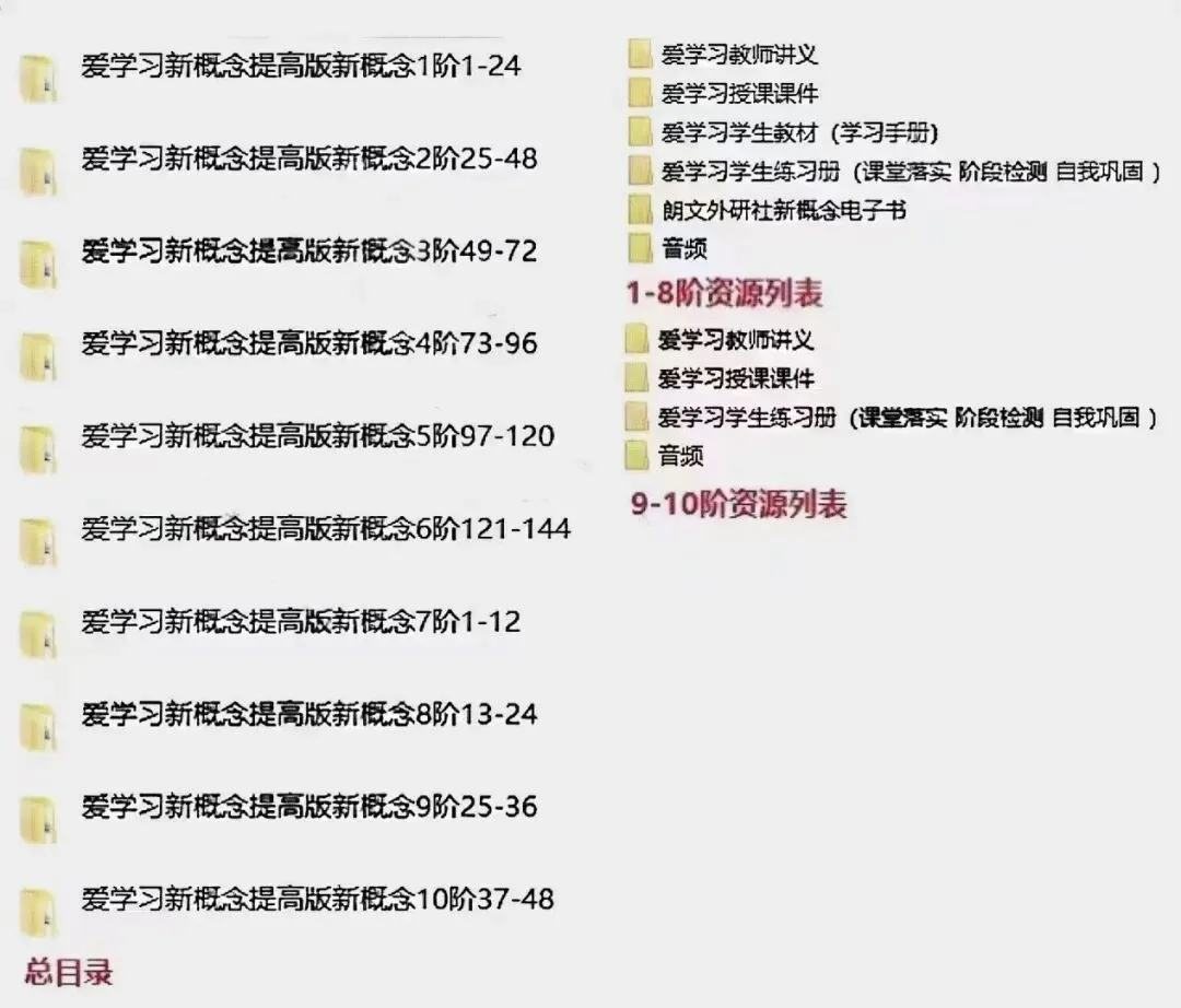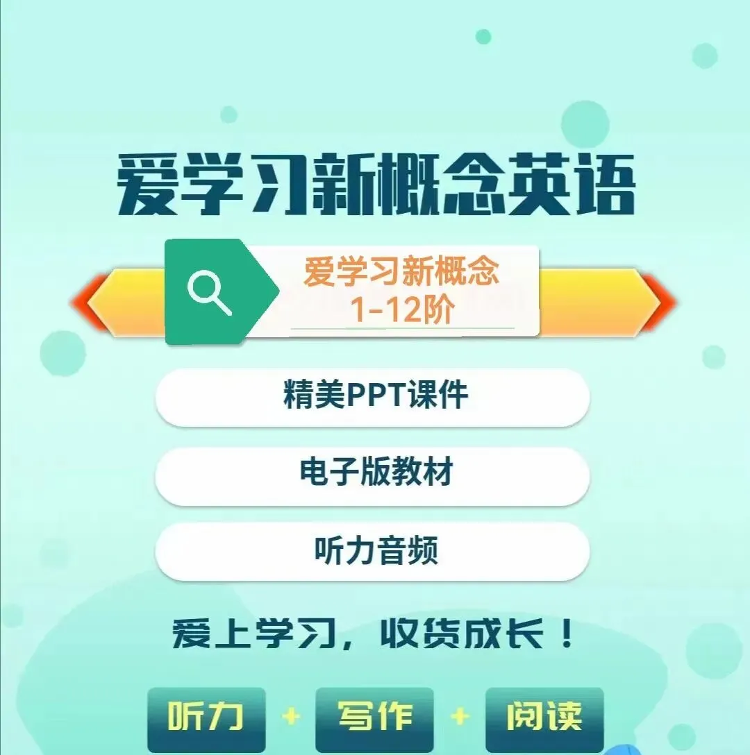 重磅资料!!最新爱学习新概念英语提高版课程体系1-12阶.包含:ppt课件,音频,教师讲义,学生教材,练习题以及答案.
