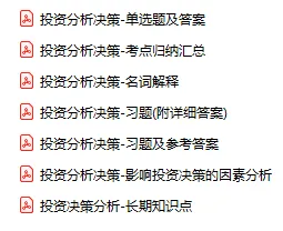 今天分享的资料是「0781-投资分析决策」电子版+学习笔记+知识点总结+期末考试重点+复习资料+习题集及答案+名词解释+历年真题试卷及答案+题库及答案+复习重点+思考题及参考答案+公式总结+考试重点基础题+知识总结+高清PDF可打印+免费分享!