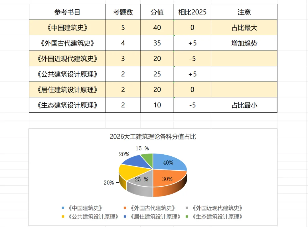 从2026年的理论各教材考题分值占比相对往年考题波动不大,属于常规出题。中国建筑史分值占比多于外国近现代建筑史,近些年的真题确实存在过于偏重中国建筑史的情况,如2025、2024、2023、2019、2016年。