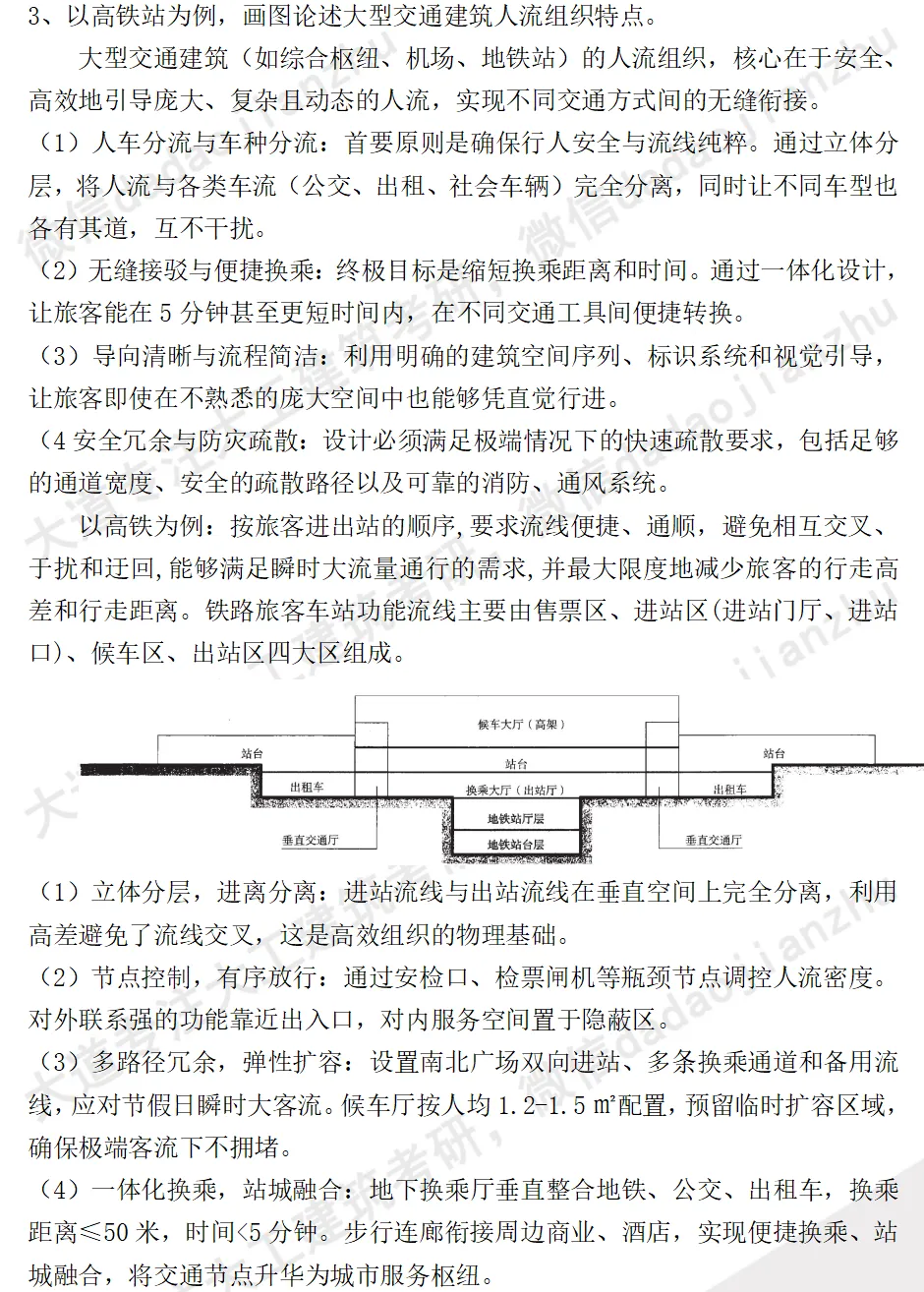 3、以高铁为例,画图论述大型交通建筑人流组织特点。