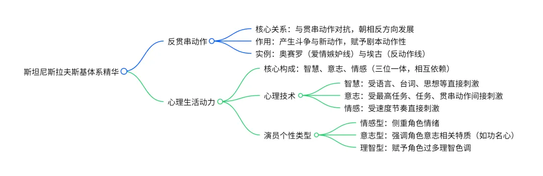 语言、台词、思想和能引起判断的概念直接影响智慧。最高任务、任务、贯串动作直接影响意志(欲望)。速度节奏直接影响情感。这对于我们的心理技术说来,难道不是一种重要的收获!(《全集》第3卷,219页)