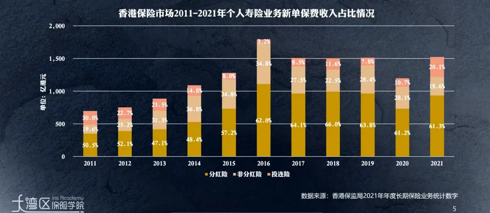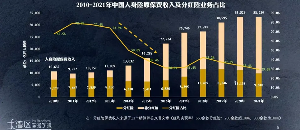 谈到分红险,大家第一个想到的就是香港保险,而分红险在香港保险中一直占据主导地位,占比高达60%以上。新加坡保险市场在亚洲地区也是非常成熟的保险市场,从下图中也可以看到分红险份额占比也很高,能达到1/3。这里为什么要拿香港和新加坡举例,因为两地都是以华人为主的地区,并且保险深度和密度都在全球处于领先地位。很多朋友可能并不认可分红险,觉得分红险是套路,分红在极端情况下是0,在买分红险时总感觉是个黑匣子,所以心里不踏实。但是,如果看看中国香港和新加坡,分红险都是主导地位,那我们是不是也可以思考一下,未来中国内地的产品形态的演化是不是也会向分红险去发展。2、保险公司为了防范“利差损”风险,不敢过多销售带有长期高保证收益的传统险。如果保险产品保证收益太高,假如未来处于低息环境,保险公司无法获得较高的保证收益,就得承担利差损风险,像90年代,几家大型头部保司都遭遇过利差损的风险。3、高保证收益产品对保险公司资本金的占用较多,容易导致偿付能力不足。所谓利差损风险,在偿付能力的管理体系下就叫做利率风险,如果带有的利差损风险越大,开发的产品承诺的保证收益越高,占用的资本金金额就越高。1、相对于收益不断降低的传统险(如利率2.0的增额寿),分红险预期收益更高。3、分红险可以确定保本和带有一定收益的基础上,还有分红可以拿。那中国内地保险行业过去有没有分红险非常风光的年代呢?中国保险市场的发展经历过四个阶段,第一个阶段是1999年之前的高利率时期;第二个阶段是1999-2013年,保监会把中国人身保险业的预定利率卡在2.5%,这个时间内传统保险产品几乎是没有市场竞争力的,如下图所示,2013年及之前分红险占比也是很高的,能达到70%以上,在这个时期内,市场王者就是分红险。随着2013年之后预定利率改革的推进,传统险产品的预定利率可以上调到3.5%、甚至是4.025%,在这种情况下,它们的优势就凸显出来了,从上图也可以看到,2013年之后,分红险占比逐渐下滑,但到2021年的时候,分红险仍有接近30%的份额。随着利率下行,会不会回到2013年之前那种分红险作为主导地位的时候呢?个人感觉,这个时代肯定会回来的。
