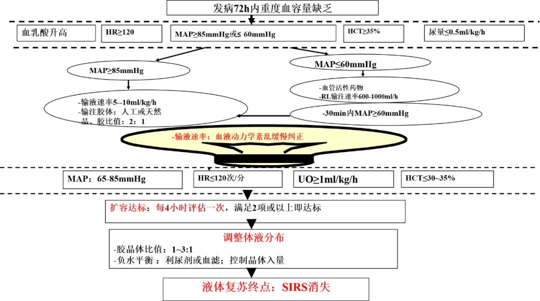 3.3急性胰腺炎的最初24小时内补液>4,100mL与持续器官功能衰竭和肾功能不全相关;即积极液体复苏导致液体过负荷的比例升高,可能对患者有害,所以强调适度液体复苏,避免过度。心率快输液后降下来,心率慢者,输液后能提升至正常就可以了。