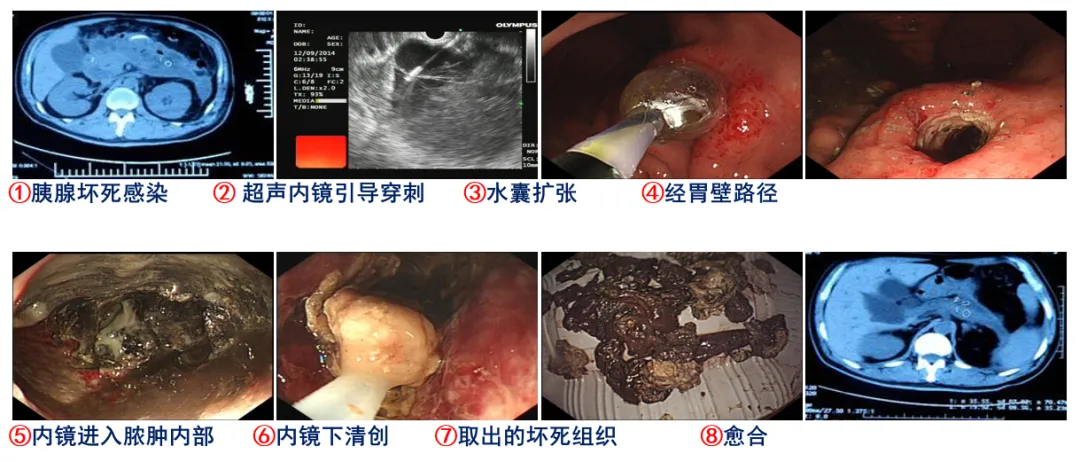 8、胰腺局部并发症及处理:1)经典外科开腹坏死清除术(PON),死亡率最高达34%;2)经皮穿刺置管引流术 (PCD),3)经内镜透壁引流术(ETD);4)经内镜透壁坏死切除术(ETN),单纯引流,坏死物清除不彻底;ETN作用直接、疗效肯定、并发症少、应用广泛,被视为一线治疗手段。