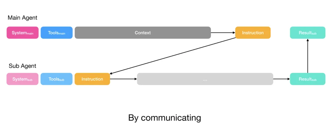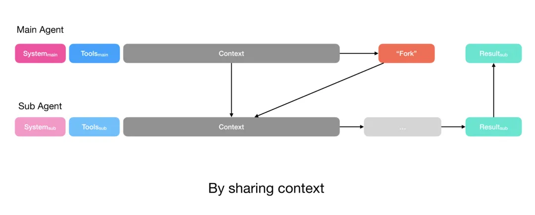 复杂任务:共享完整上下文,子 Agent 有自己的工具和指令